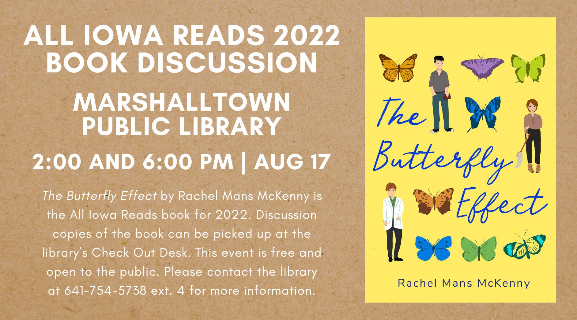 The Butterfly Effect by Rachel Mans McKenny is the All Iowa Reads book for 2022. The book discussion will be held August 17th at 2:00pm and 6:00pm in the big meeting rooms. Discussion copies of the book can be picked up at the library’s Check Out Desk. This event is free and open to the public. Please contact the library at 641-754-5738 ext. 4 for more information.