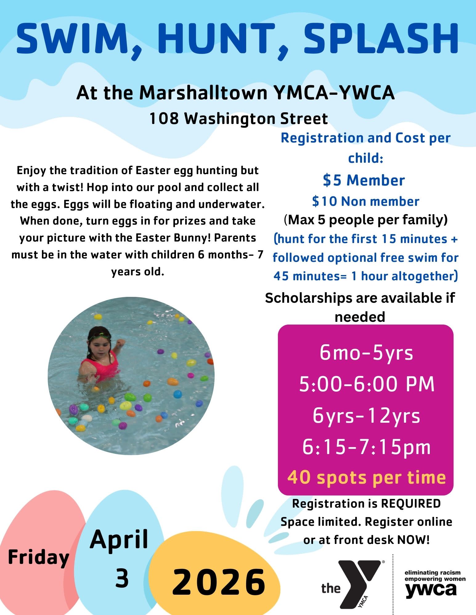 Enjoy the tradition of Easter egg hunting but with a twist! Hop into the Y pool and collect all the eggs. Eggs will be floating and underwater. When done, turn eggs in for prizes and take your picture with the Easter Bunny! Parents must be in the water with children 6 months- 7 years old.