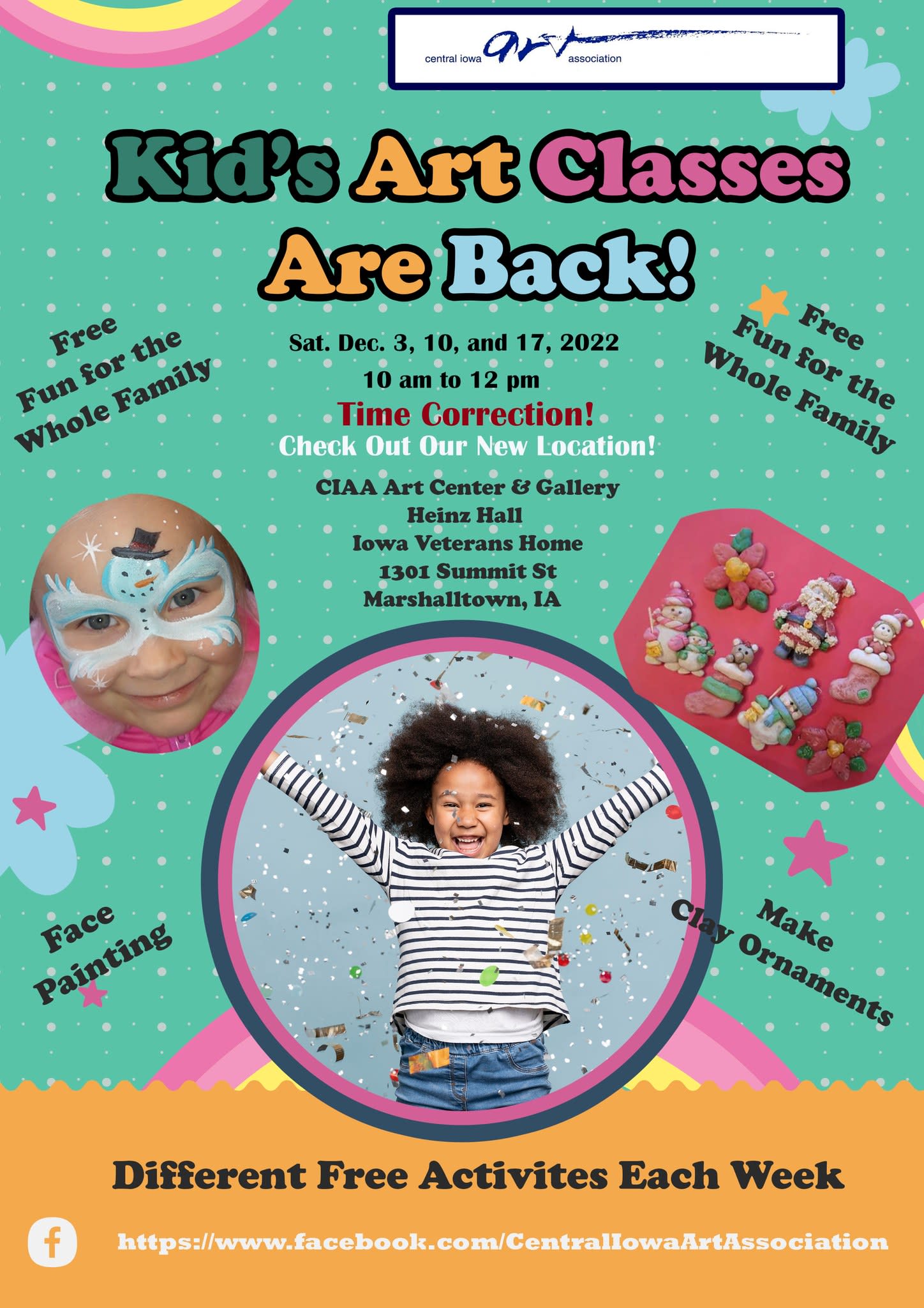 Free Kid's Art Classes are back for the first 3 Saturdays in December at the Central Iowa Art Association located at the Iowa Veterans Home, Heinz Hall, 1301 Summit St. Marshalltown, IA 50158. No preregistration is needed. Kids and parents can just show up