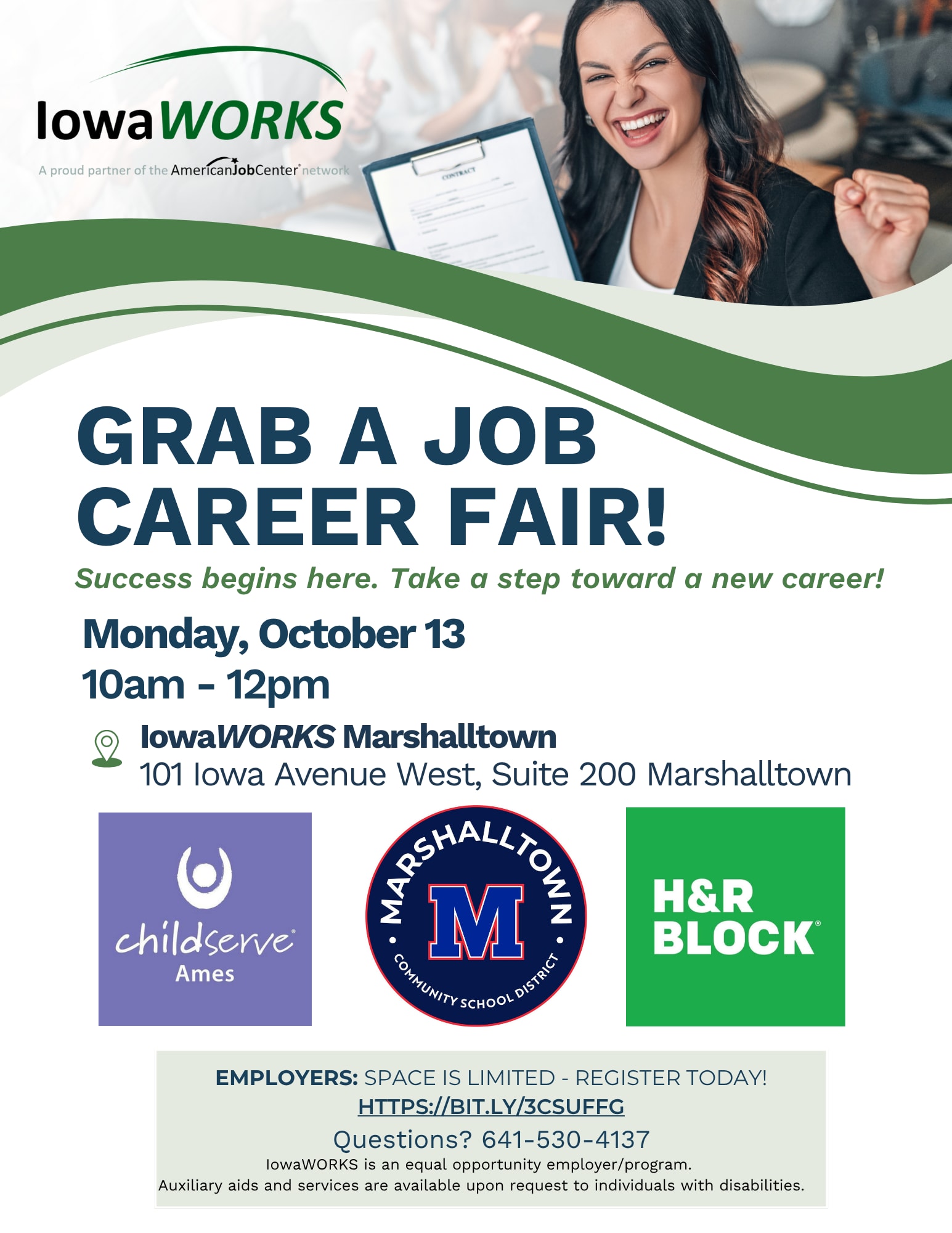 This month’s event is taking place October 13 from 10:00 am to 12:00 pm. Representatives from Marshalltown Community School District, H&R Block, and Childserve Ames will be participating, with openings that include full-time, part-time, and seasonal career opportunities as well as resources for job seekers.