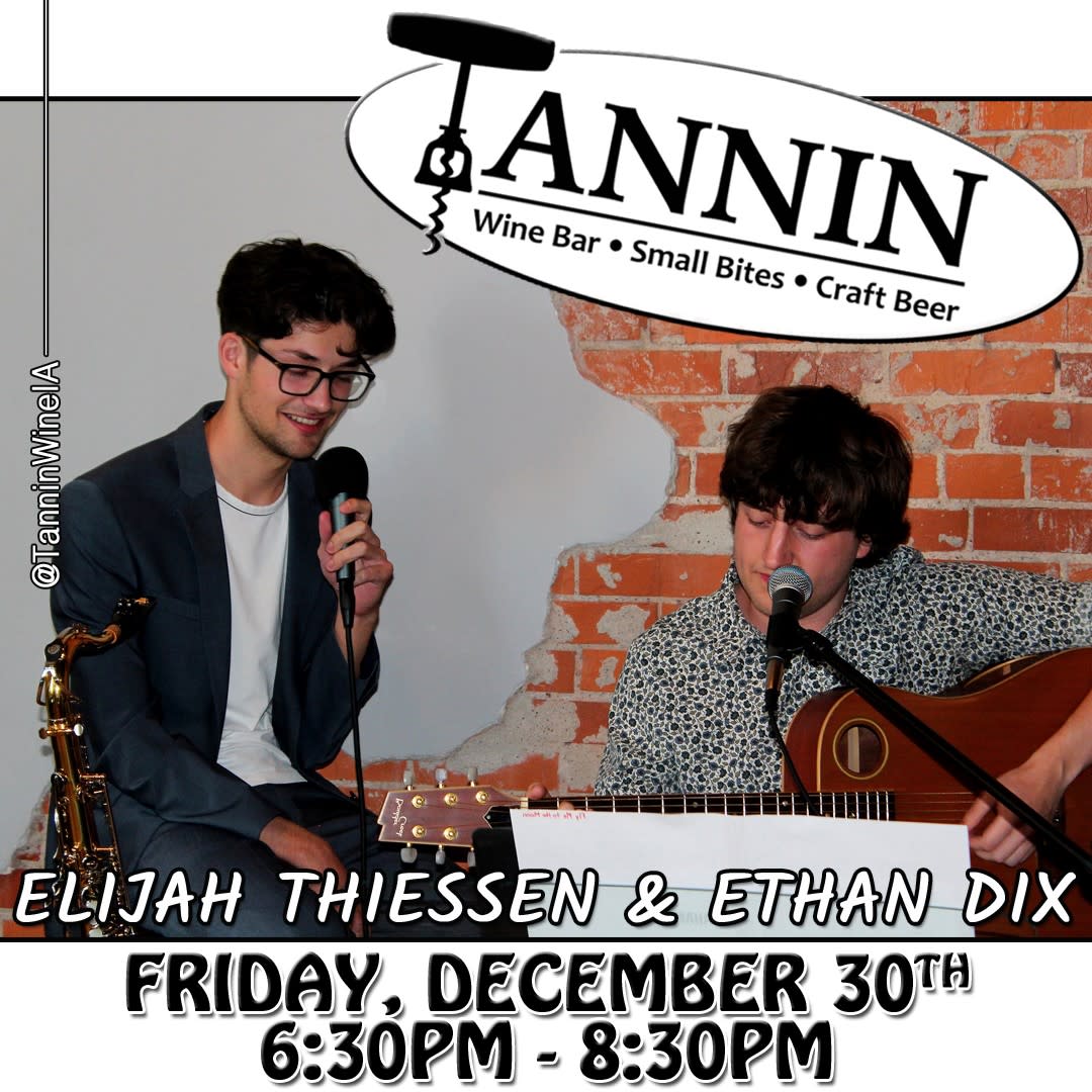 It’s night full of Marshalltown talent as Eli Thiessen & Ethan Dix join us at Tannin on Friday, December 30th from 6:30pm-8:30pm! Make sure to bring your friends & enjoy drinks, snacks & your favorites from the jazz & Sinatra worlds!