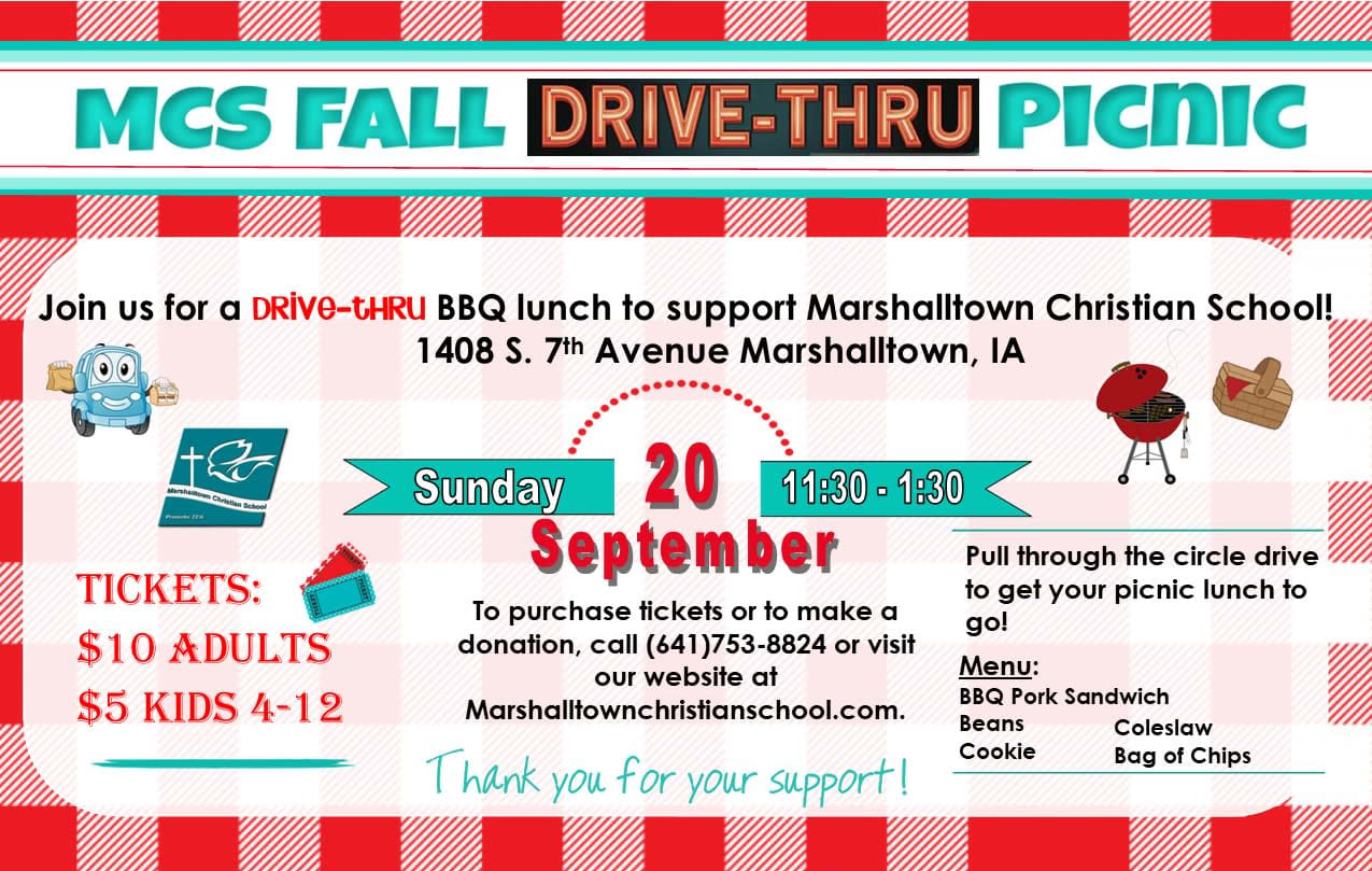 Join Marshalltown Christian School for a BBQ lunch in curbside, pick-up style on Sunday, September 20 from 11:30 a.m. to 1:30 p.m. Unique times call for a new and different flair. Get your tickets at the door or by contacting MCS at (641)753-8824. Thank you for supporting Christian education!Images