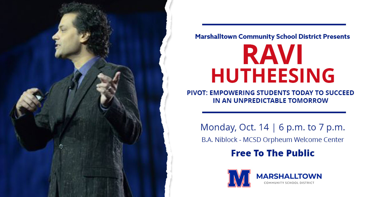 The Marshalltown Community School District (MCSD) is excited to announce a special community presentation by Ravi Hutheesing, titled "PIVOT: Empowering Students Today to Succeed in an Unpredictable Tomorrow."