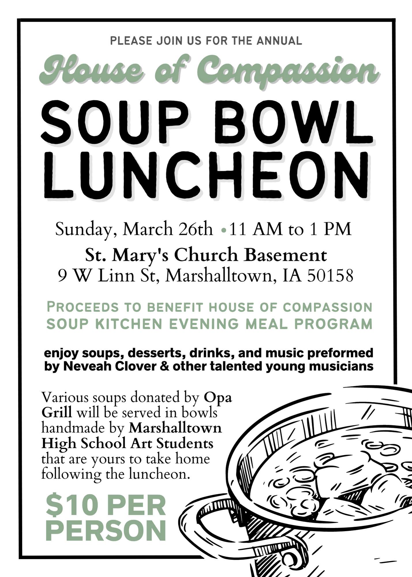 Mark your calendars for our upcoming annual soup bowl luncheon on Sunday, March 26th. We hope to see you there!