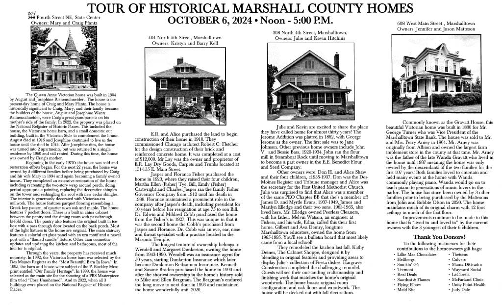 The Historical Society of Marshall Conunty's home tour will feature four homes in Marshalltown and two in State Center. The event is designed to raise funds to promote HSMCs mission. Marshalltown: Jerry and Cheri Coleman, 301 S. 9th St., Kevin and Julie Hitchins, 308 N. 4th St., Kerry and Barry Kell, 405 N. 5th St., Jennifer and Jason Matteson, 608 W. Main St..State Center: Jenny and Beau Hanson, 202 Third Ave., NW., and Craig and Mary Pjantz, 201, Fourth Ave., NE.