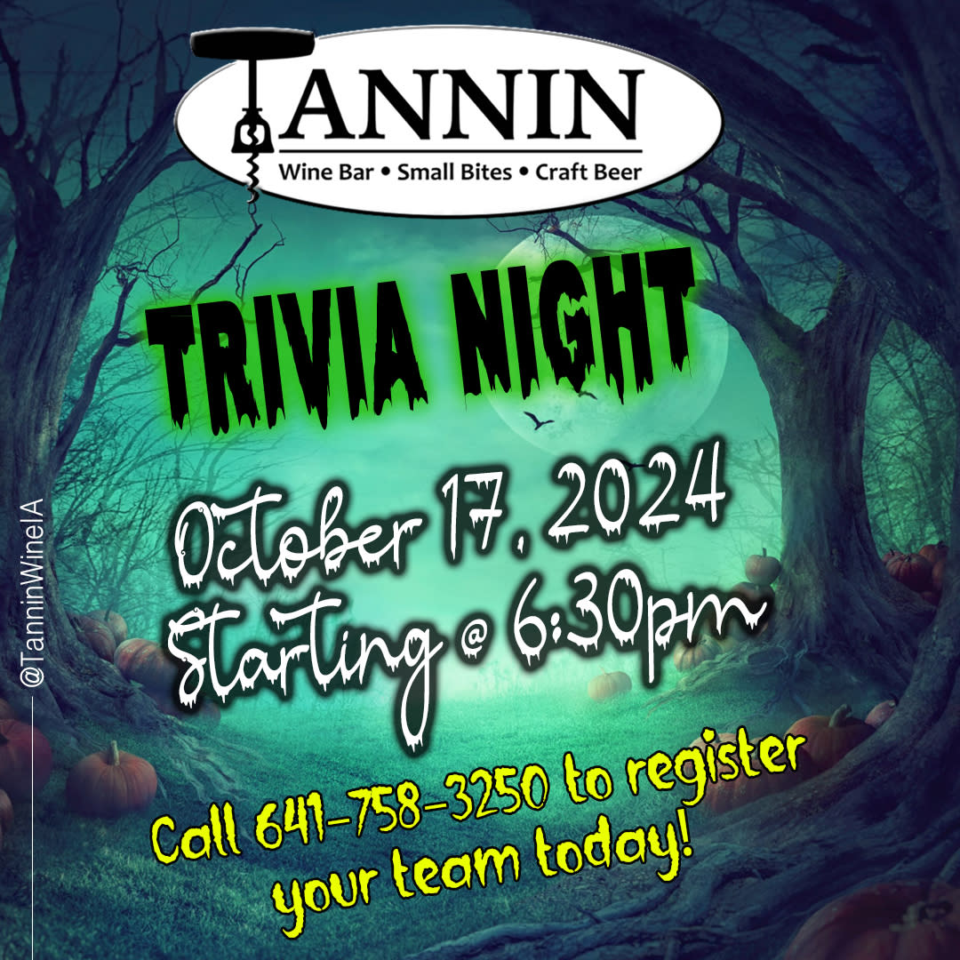 Trivia Night is back & it’s time to get SPOOKY on Thursday, October 17th starting at 6:30pm! Make your team reservations now & enjoy a night of SPOOKY trivia! We request reservations for teams of up to 4 members. Overall winning team is awarded a $25 Tannin Gift Card!! Plus come in your Halloween Costume & you get a chance to win a $20 Tannin Gift Card if you are picked as the best costume of the night!